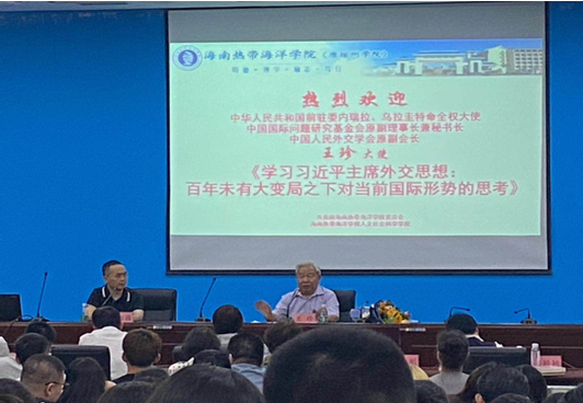 这是新葡的京集团8814国际事务与国际关系专业开展的“外交官讲坛”第一讲,也是我校团委开展的“青年讲堂·一起学党史”第二讲。新葡的京集团8814国际事务与国际关系专业师生近200人聆听了讲座,讲座由国际事务与国际关系专业负责人黄田园博士主持。与国关专业共建实践教学基地的合作方海南中金鹰和平发展基金会的有关同志出席,并与王珍大使亲切交流。