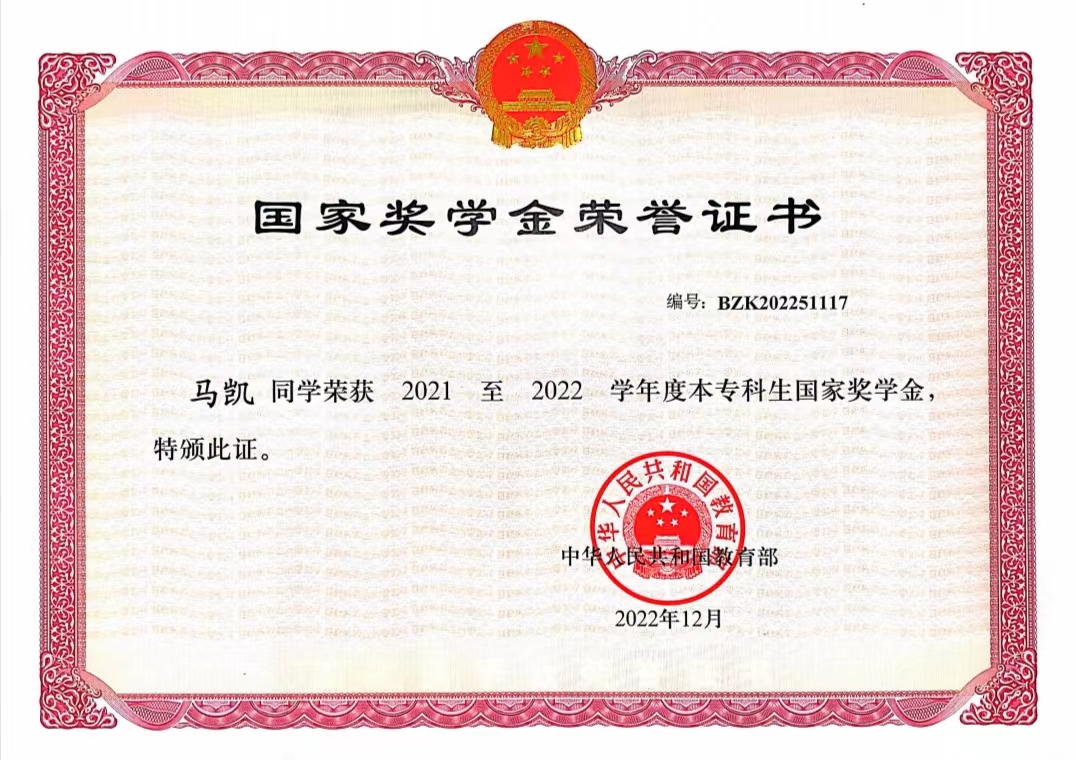在大学期间,马凯同学具备团队精神,积极参与海南省创新创业大赛,能积极投身社会实践及志愿服务,作为一名党员,他时刻起到模范带头作用,在学校年度评优中多次获评“三好学生标兵”;多次获得国家励志奖学金;在全国高校传统文化知识竞答海南省一等奖;第十七届全国大学生文学创作大赛三等奖;在2021至2022学年度荣获本专科生国家奖学金。