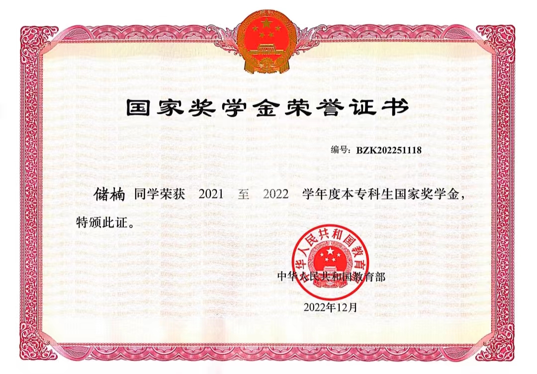 在校期间,储楠同学在大学期间荣获多项奖章。连续三年评为“三好学生标兵”;2022年5月在第三届大学生“丝绸之路”主题竞赛中获得特等奖;在第十七届全国大学生文学作品大赛中获得一等奖;在诗词竞答大赛中获得决赛一等奖。在2021至2022学年度荣获本专科生国家奖学金。
