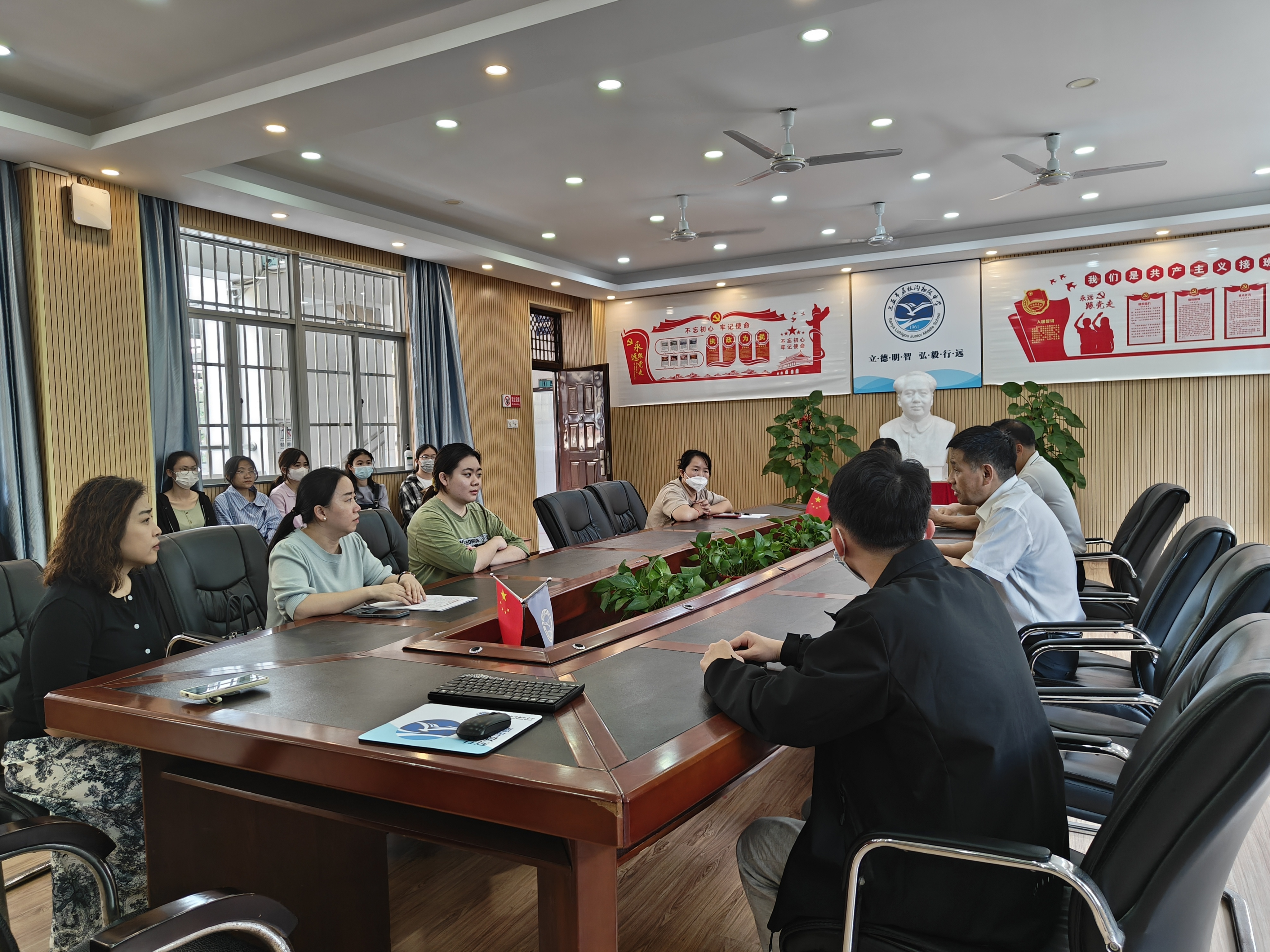 上午10点,实习单位在三亚市四中教务会议室召开了实习工作会议,三亚市第四中学闵校长、教导处张主任、语文教研组组长桂老师以及各位实习指导老师接待了实习生,并对实习工作做了部署和安排。会上,闵校长对双方单位多年的实习合作给予肯定,希望实习生们能在实习过程中检验学习内容、积累工作经验。教导处张主任对实习的工作做了细致安排,并对实习生们提出了明确的实习要求。语文组教研组长桂老师为实习生们安排了一对一的实习指导老师,并就相关工作做了具体安排。