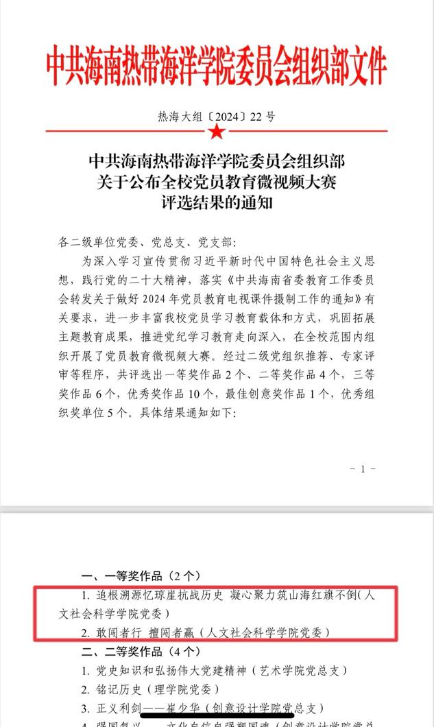 在此次大赛中,新葡的京官网党委表现出色,作品《追根溯源忆琼崖抗战历史 凝心聚力筑山海红旗不倒》《敢闯者行 擅闯者赢》荣获一等奖。