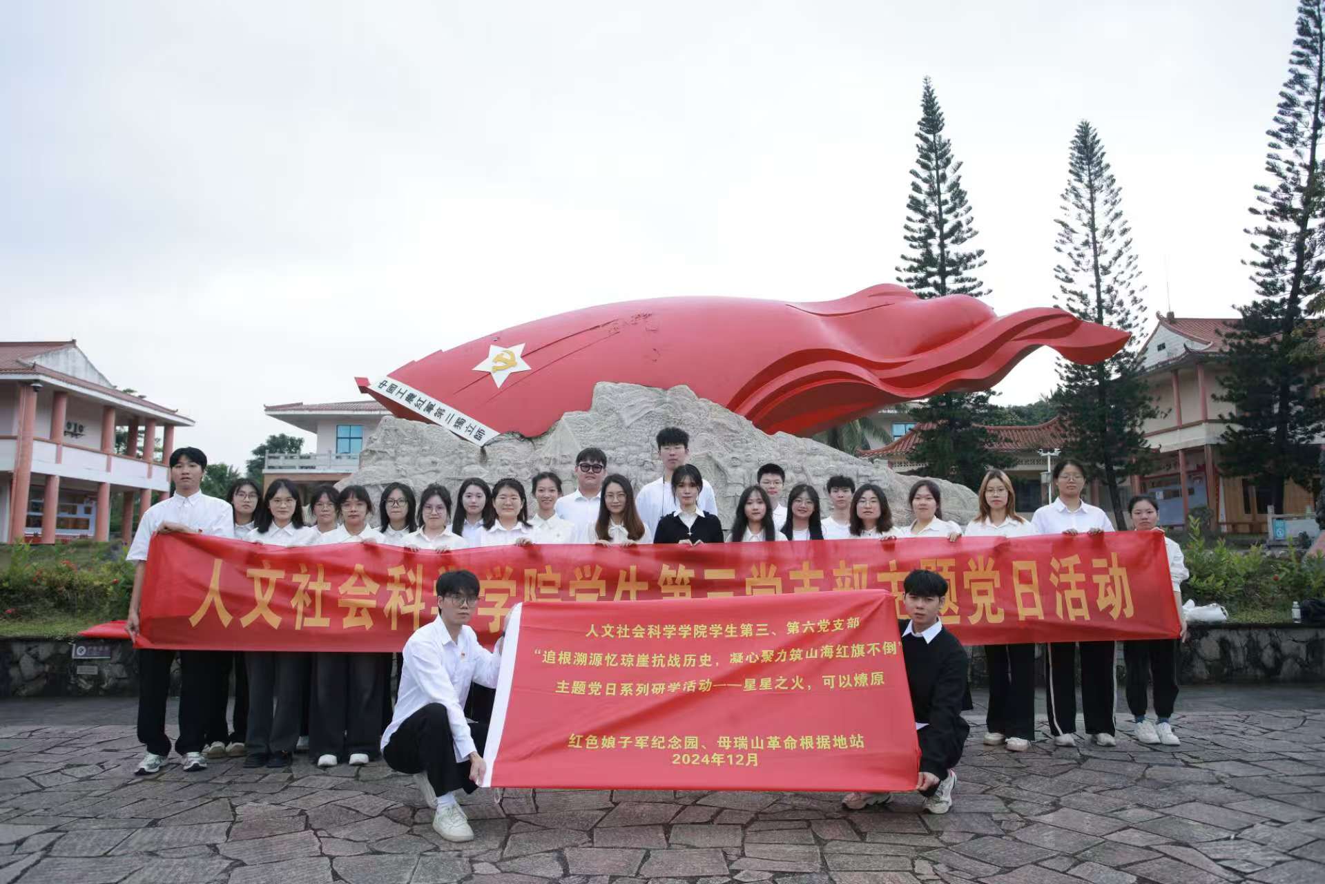 为深入学习贯彻党的二十大精神,加强党员对革命历史的了解,增强党性教育和革命传统教育,铭记琼崖革命光辉历史,传承母瑞山精神。12月7日至12月9日,新葡的京集团8814学生第三、第六党支部前往红色娘子军纪念园、母瑞山革命根据地站,开展以“追根溯源忆琼崖抗战历史,凝心聚力筑山海红旗不倒”为主题的党日研学活动。共有教师党员2名,学生党员11名,入党积极分子16名参与本次活动。