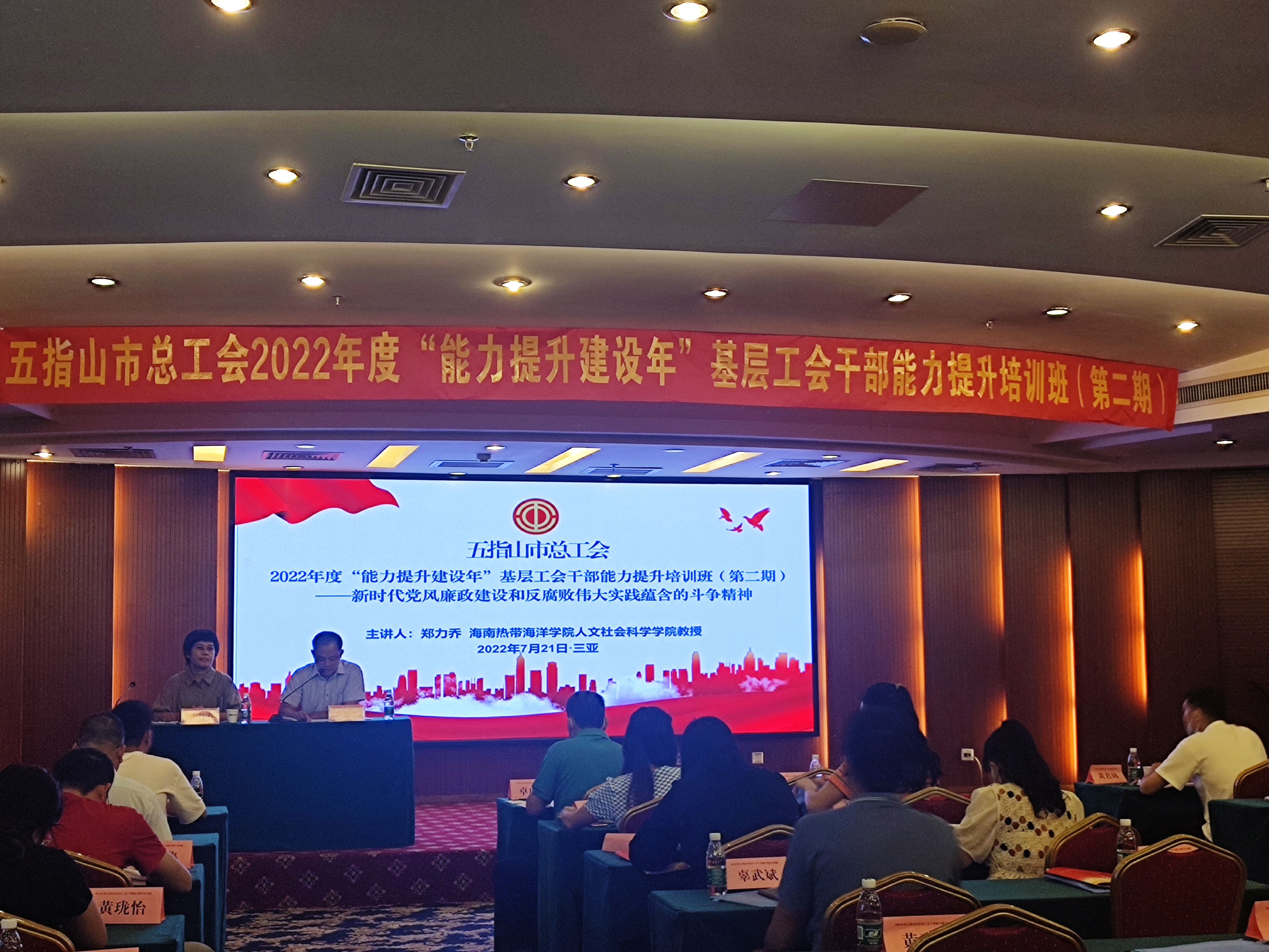 7月21日下午,新葡的京集团8814党委书记郑力乔教授应邀为五指山市总工会“能力提升建设年”基层工会干部能力提升培训班(第二期)做辅导讲座,讲座题为“新时代党风廉政建设和反腐败伟大实践蕴含的斗争精神”,五指山市总工会基层干部53人参加了培训,培训以“理论+案例”形式开展,现场培训效果良好,授课获得培训学员的一致好评。
