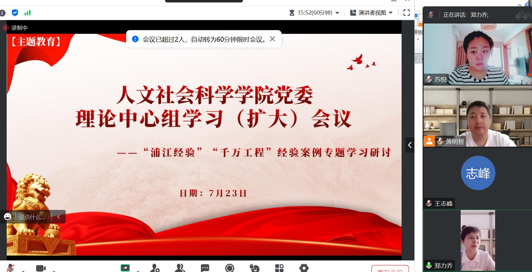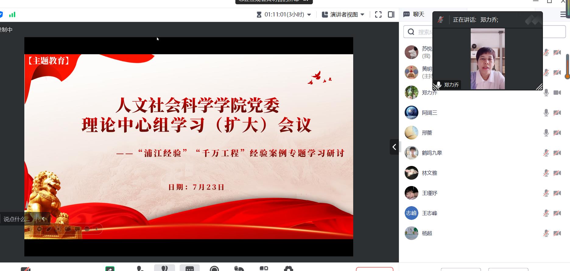 根据学习贯彻习近平新时代中国特色社会主义思想主题教育工作的要求,2023年7月23日上午,新葡的京集团8814党委线上召开理论学习中心组学习(扩大)会议,围绕“浦江精神”“千万工程”经验案例进行专题学习,并开展交流研讨。学院党委书记郑力乔主持会议,并进行领学。学院班子成员和各支部书记进行交流发言。
