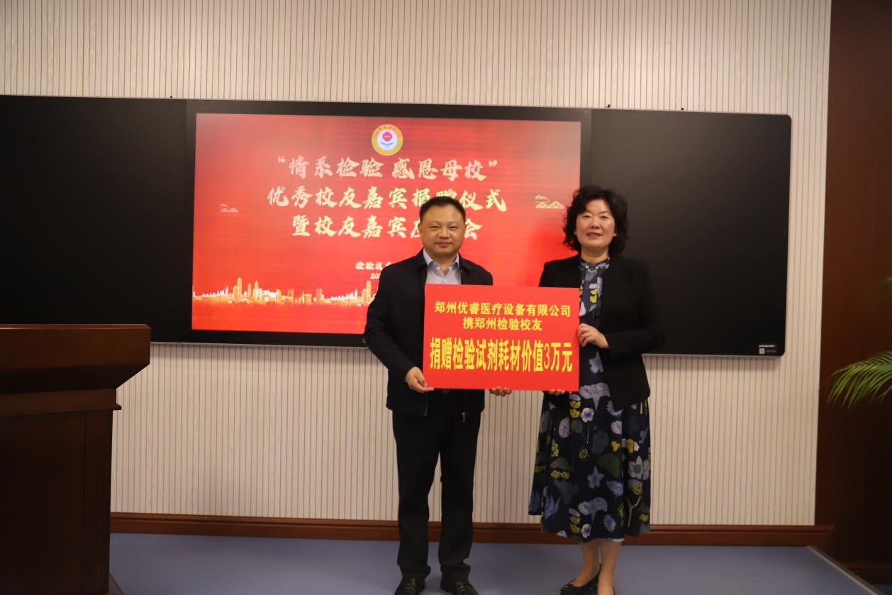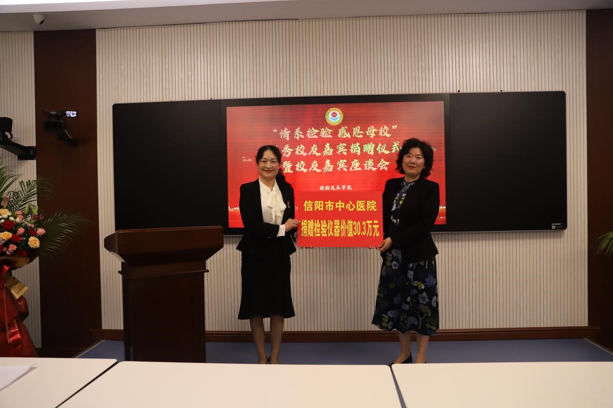 蒋有红代表学校接受校友、嘉宾捐赠并为捐赠颁发荣誉证书。捐赠仪式上,信阳市中心医院、广东凯普生物科技股份有限公司、河南华之源生物技术有限公司、郑州安图生物工程股份有限公司等企业向学校捐赠了一批医学教学仪器、实验仪器、医学书籍和树木等,捐赠总价值达180多万元。