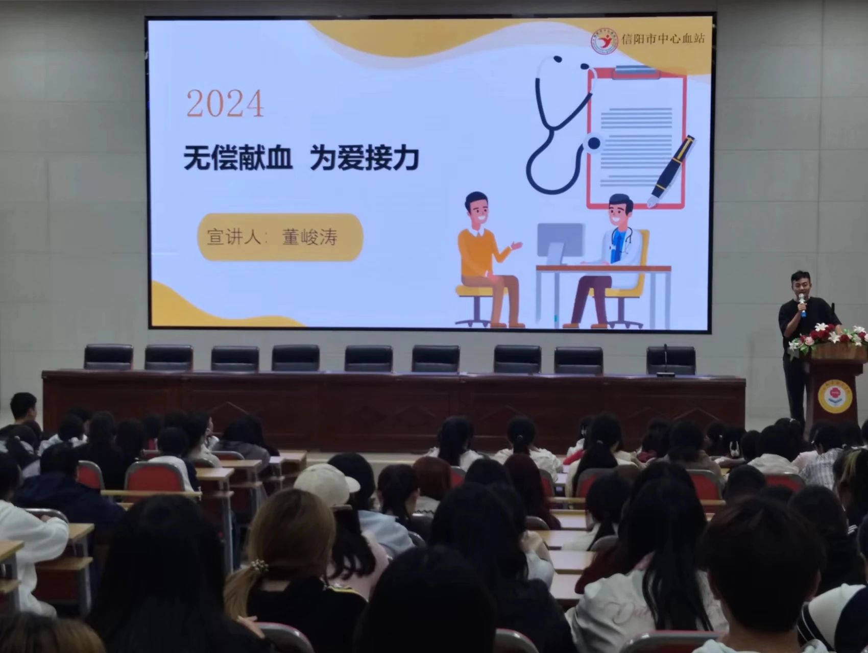 联创活动在无偿献血科普教育中开始。信阳市中心血站宣讲人董峻涛向参与献血的老师和2024级新生们科普了无偿献血的知识,讲解了无偿献血的意义,用图片和视频展现了当代无偿献血者的风采。通过宣讲,师生们对于无偿献血的重大意义有了更深的认识和了解,增强了积极参与无偿献血用热血传递爱与希望自觉性。