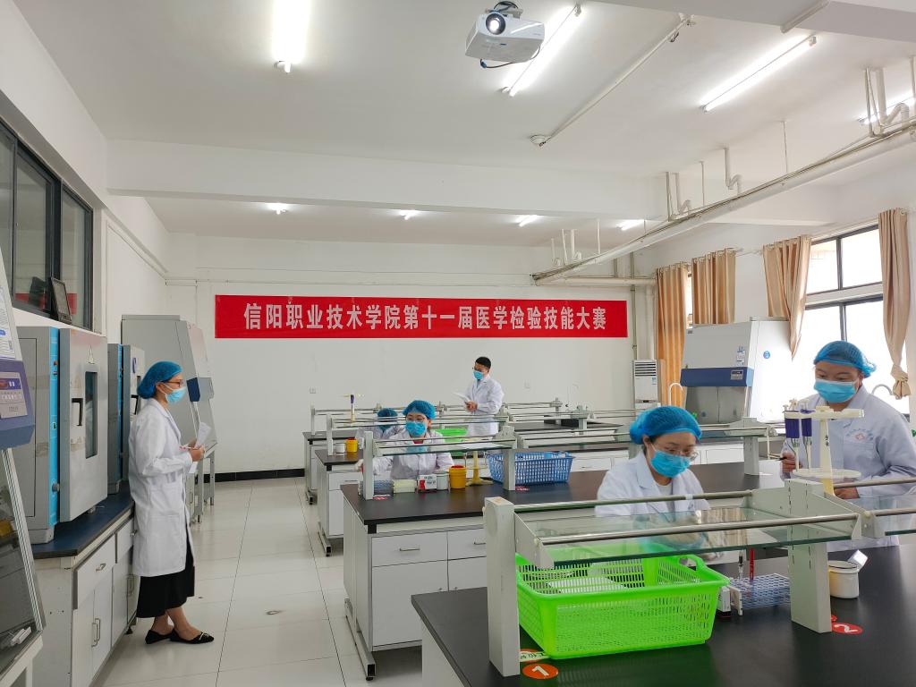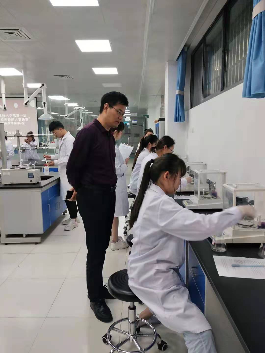5月25日下午,SUNBET申搏官方网站医学检验技术专业、卫生检验与检疫技术专业分别在实训楼6409、7206实验室开展了专业技能大赛决赛。教务处副处长任传忠到现场指导,SUNBET申搏官方网站院长陶玲、副院长张永海、免疫学检验教研中心老师、卫生检验检疫教研中心老师及25名选手参加此次竞赛。