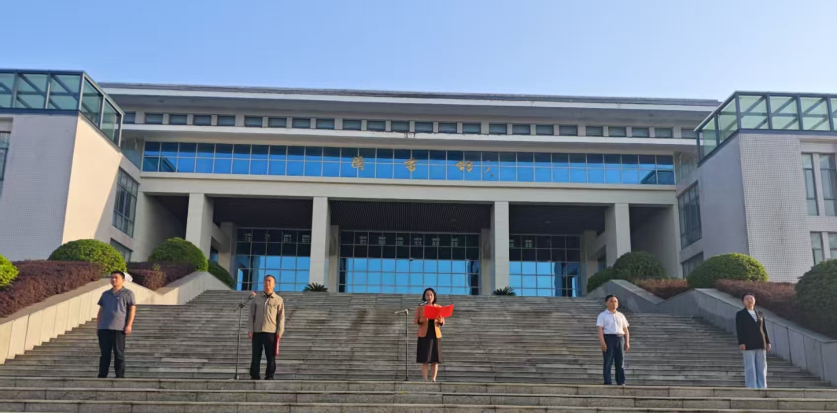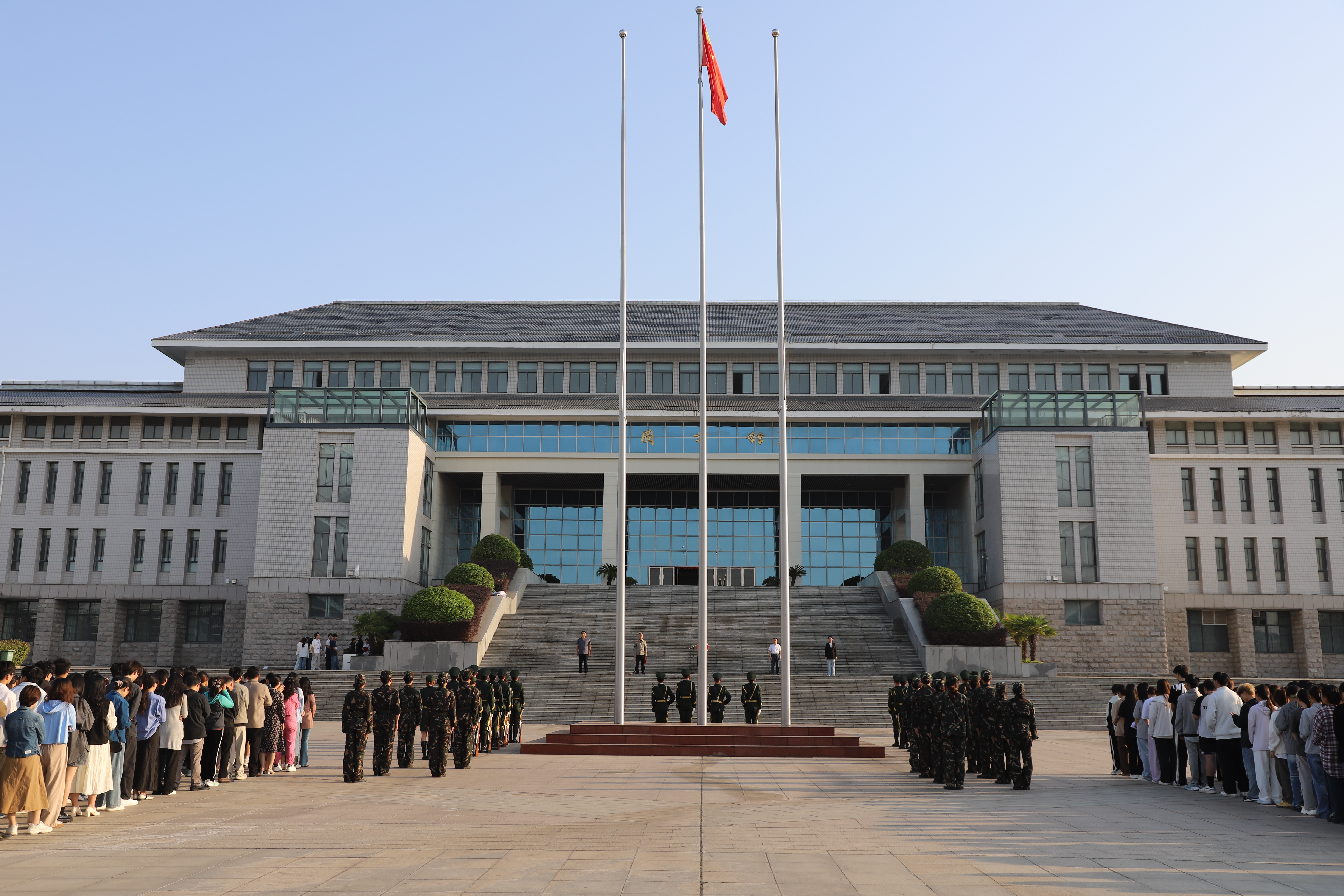 6:58分学校国旗护卫队迈着整齐的步伐走向升旗台,7:00整伴随着雄壮的《义勇军进行曲》,鲜艳的五星红旗冉冉升起,全院师生怀着敬意,列队肃立,齐唱国歌,表达对祖国的无限忠诚与热爱。