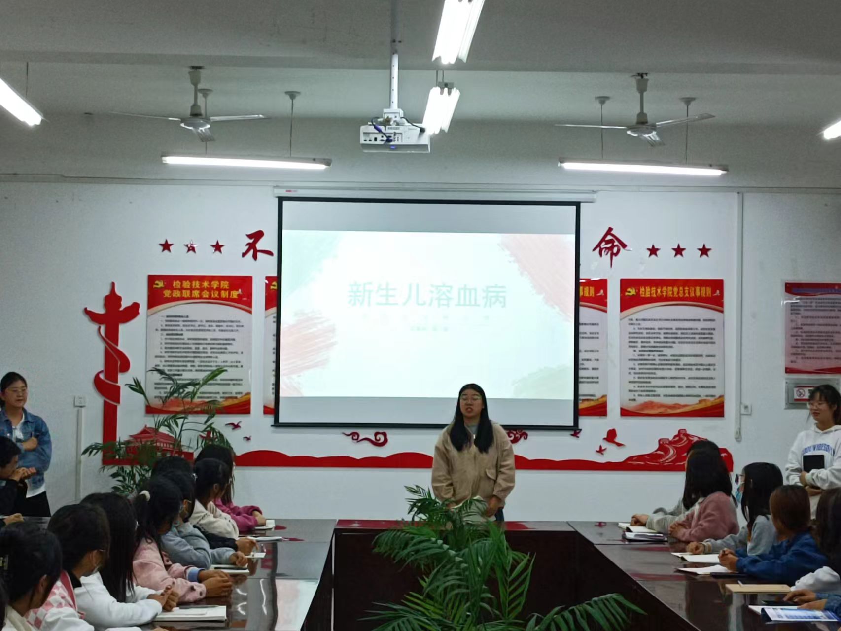 本次汇报内容是大二社员在课下查阅的与检验专业相关知识的前沿文献。首先,由张悦同学对查阅的新生儿溶血相关文献进行汇报,她从好发人群、临床表现和治疗等方面介绍新生儿溶血病,加深社员们对新生儿溶血病的认识。随后,冯阳阳从血液的采集与运输的影响因素及规范操作等方面对查阅的文献进行了汇报。两组同学汇报结束后,朱兆宇老师对汇报的内容及汇报时社员的表现进行了点评,并提出了要求,希望社员们再接再厉,充分运用文献检索这一方式加强对检验专业的了解,并不断提高学习兴趣。