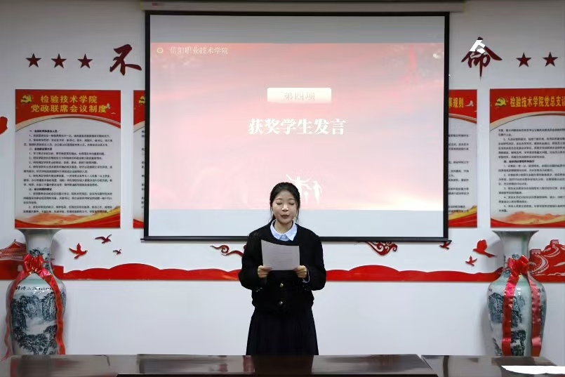国家励志奖学金学生代表韩梦想、国家助学金学生代表代美丽先后发言,她们分享自己的学习历程与受助感悟,真挚的话语饱含对国家的感恩,也表达了奋勇拼搏、不负期望、回馈社会的决心。