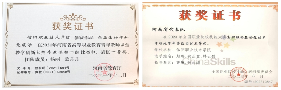 医学检验技术专业传承于全国重点中专信阳卫生学校的检验士专业,该专业开设于 1973 年,至今已有52年的办学历史,为河南省医学检验事业做出卓越贡献。在全体师生的共同努力下,先后被确定为省高职高专教学改革试点专业、省示范性高职院校重点建设专业、省骨干建设专业、省职业教育医学检验技术示范性未来建设专业;专业核心课程《生物化学检验技术》被认定为国家级精品在线开放建设课程,《微生物学检验》、《免疫学检验》、《血液学检验技术》和《临床基础检验技术》被认定为省级精品在线开放建设课程,《免疫学检验》和《血液学检验技术》被认定为省级课程思政示范课程;参与完成教育部国家级教学和实习标准的研制项目3项,参与完成国家高等职业教育医学检验技术专业教学资源库建设;在2023年权威评价机构“金平果”发布的第四次全国高职院校专业竞争力排行榜中,学院医学检验技术专业位居全国高职同类专业第一,充分证实了学院医学检验技术专业建设的行业地位。