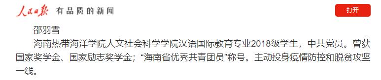 习近平总书记寄语广大青年:“当代中国青年是与新时代同向同行、共同前进的一代,生逢盛世,肩负重任。”五四青年节,《人民日报》专版刊登《本专科生国家奖学金获奖学生代表名录》展示本专科生国家奖学金获奖学生中优秀代表的风采,我院2018级汉语国际教育专业学生邵羽雪获评获奖学生优秀代表。