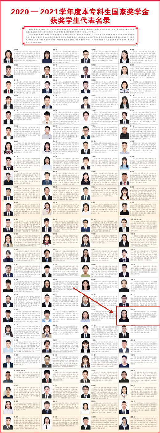 为激励广大青年学子勤奋学习、积极进取,努力成为德、智、体、美、劳全面发展的堪当民族复兴重任的时代新人,国家设立本专科生国家奖学金,用于奖励特别优秀的全日制本专科学生,经过严格选拔和评审。全国6万名优秀本专科学生荣获2020—2021学年度国家奖学金,又从中评选出100名学生,作为获奖学生的优秀代表收录名录。