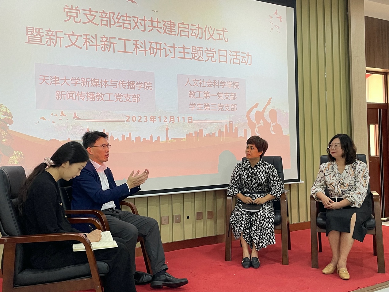 12月11日上午,党支部结对共建启动仪式暨新文科新工科科研主题党日活动在人文楼103召开,天津大学新媒体与传播学院党委书记王赞、新葡的京官网党委书记郑力乔、院长王志峰、教工第一党支部书记张馨予、学生第三党支部书记王瑾妤、新闻专业部分党员、预备党员、入党积极分子出席了会议。