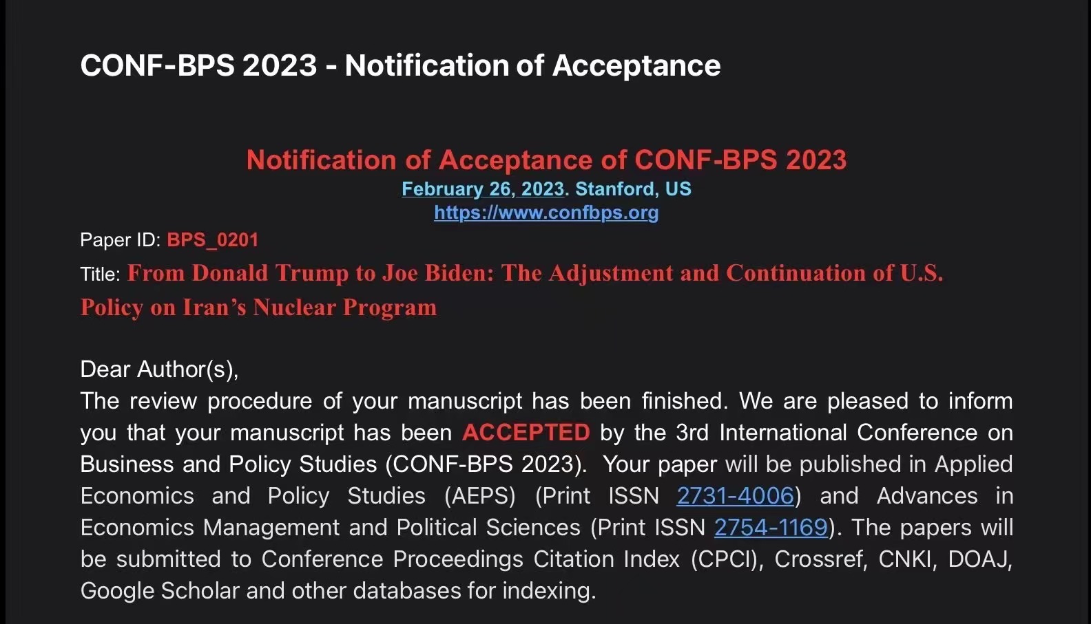 国关18班学生梁书铭的论文From Donald Trump to Joe Biden: the adjustment and continuation of U.S. policy on Iran’s nuclear program于2022年4月7日收到CPCI旗下会议组委会的收录通知。这充分说明国关系培养的学生中成绩优秀者已具备撰写并发表国际会议论文的能力。