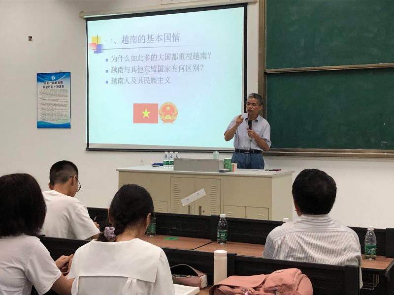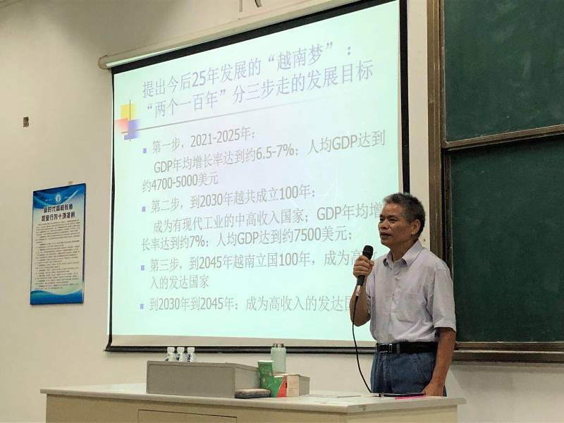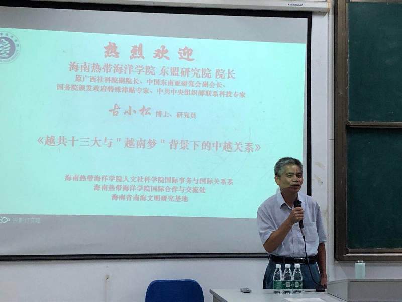 “学史明理、学史增信、学史崇德、学史力行”,这是迎接建党100周年之际,习近平总书记对“学党史、悟思想、办实事、开新局” 学习教育活动的殷切倡议。响应这一时代号召,6月3日晚,新葡的京集团8814东盟研究院院长古小松应人文社科学院、海南省南海文明研究基地之邀在4206作题为《越共十三大与“越南梦”背景下的中越关系》的讲座。讲座的举办得到了国际合作与交流处的支持。讲座由国际事务与国际关系专业负责人黄田园主持,人文社科学院副院长方礼刚、国际合作与交流处处长邓颖颖出席,人文社科学院及海南省南海文明研究基地的师生近200人参加本次讲座。